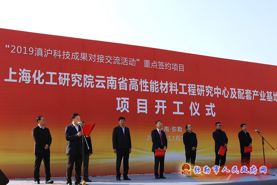 12月19日,“2019滇沪科技成果对接交流活动”重点签约项目上海化工研究院云南省高性能材料工程研究中心及配套产业基地项目开工仪式在弥阳工业园区举行。弥勒市委书记包旭出席开工仪式,并宣布项目开工,市委副书记、市长梁凌云致辞。红河州科技局局长刘杰,上海科技交流中心副主任王海春,上海化工研究院总工程师吴向阳;弥勒市人大常委会主任马勇同志,市政协主席张茹权,市委常委、常务副市长马金荣,市委常委、市委办主任姚治明出席开工仪式。