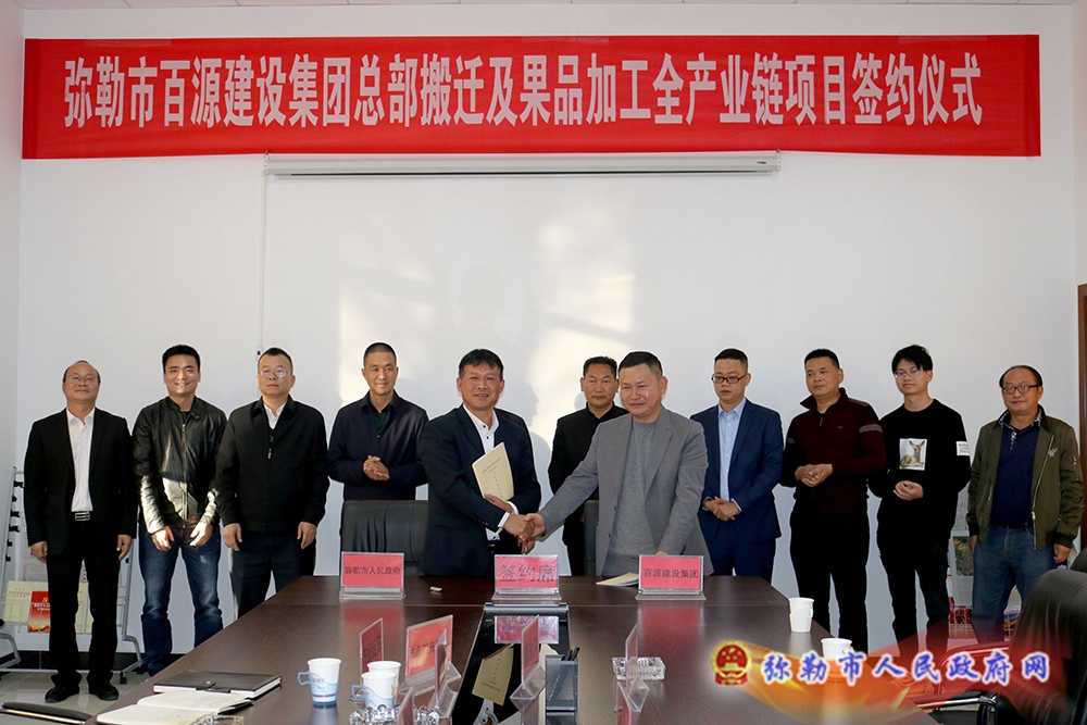 1月13日,弥勒市人民政府与云南百源建设(集团)有限公司签订投资合作协议。市委常委、常务副市长马金荣代表市政府与百源建设集团签约。弥勒工业园区管委会主任唐举顺,市政府办、市自然资源局、市农科局、市工商信局、市投资促进局主要负责人参加签约仪式。