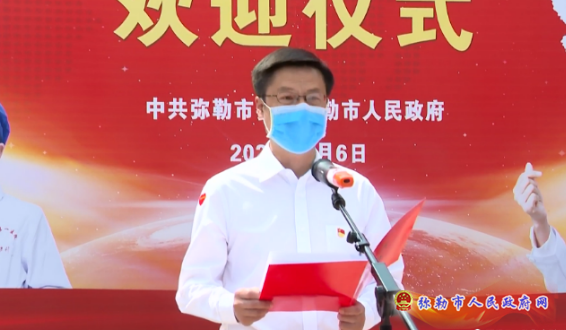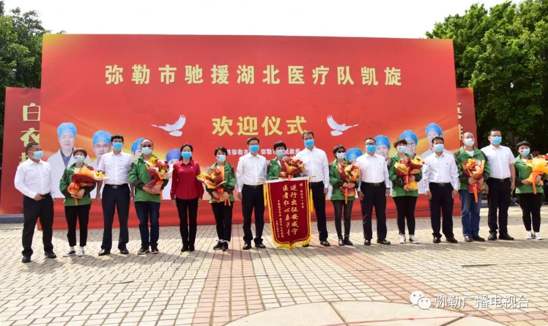 千里远征时,朔风凛冽寒未尽;英雄归来日,春华正浓花满枝。4月6日下午,弥勒市支援湖北医疗队的8名医护人员在昆明经过了14天的集中休养之后,平安返回弥勒。中共弥勒市委、市人民政府在湖泉广场举行隆重仪式,热烈欢迎英雄回家。市委书记梁凌云出席欢迎仪式并讲话,市委副书记、代理市长李健主持仪式。