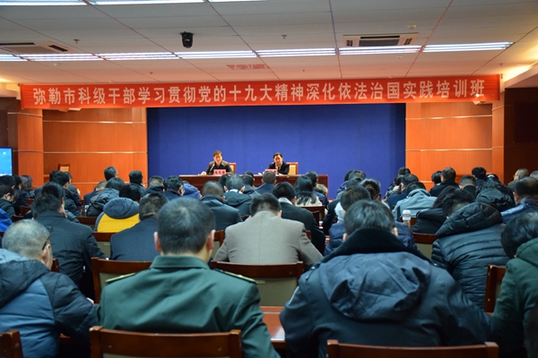 杨天东主持培训仪式指出,本次培训班的举办目的是深入学习贯彻党的十九大精神,以习近平新时代中国特色社会主义思想为引领,深刻领会党的十九大报告关于深化依法治国实践新要求、新部署,全面提高全市科级领导干部运用法治思维和法治方式深化改革、推动发展、化解矛盾、维护稳定的能力,在全社会营造“学法、用法、尊法、守法”的良好氛围,将全面依法治市工作推向深入,为推动弥勒全力融入滇中、率先开放发展提供坚强有力的司法保障。