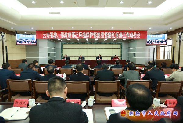 根据省委、省政府统一部署,云南省第三环境保护督察组于11月26日进驻红河州开展环境保护督察工作。11月27日,云南省第三环境保护督察组督察工作动员会在红河召开,督察组组长张登亮、副组长徐璇就做好督察工作分别作了讲话,红河州州委书记姚国华作了动员讲话。