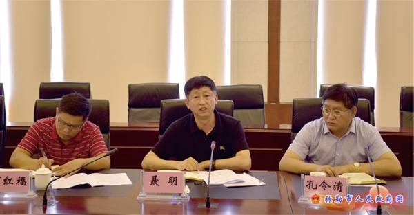 图为汇报会上,聂明、孔令清听取我市的情况汇报