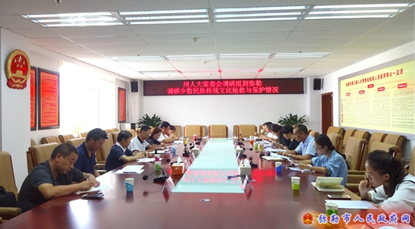 座谈会上,市人民政府副市长彭涛向调研组汇报了全市少数民族传统文化抢救与保护工作取得的主要做法及成效、存在问题和下一步打算,州人大调研组对我市少数民族传统文化抢救与保护工作所取得的成绩给予充分的肯定。