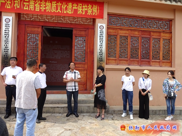 调研组实地调研了西三镇蚂蚁哨村文化农庄、非遗传习馆。蚂蚁哨村委会总支书记曾虎龙、弥勒市文化馆馆长陈保舜为大家介绍当地民族文化抢救与保护的基本情况。