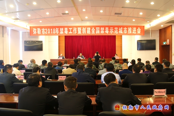 2018年10月25日,弥勒市召开“2018年禁毒工作暨全国禁毒示范城市创建工作推进会”,市委常委、市委政法委书记张俊忠主持会议,副市长、市禁毒委主任、市公安局局长彭涛,各禁毒委成员单位、各乡镇和东风农场管理局主要领导、禁毒委相关人员参加会议。