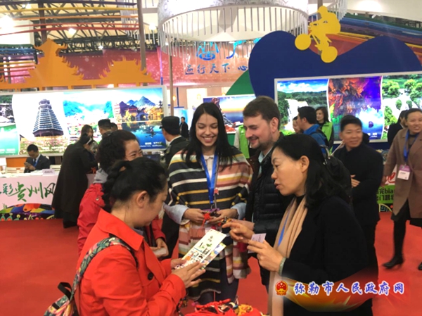 图为田红梅副市长为国内外游客介绍弥勒旅游