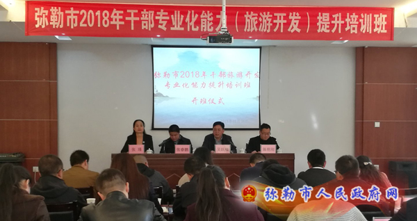 11月26日上午由市委组织部主办,市旅发委、市委党校协办的弥勒市2018年干部专业化能力(旅游开发)提升培训班在市委党校开班。市委常委、市委组织部部长吴跃福,市委党校、市旅发委主要负责人出席开班仪式,来自全市相关行政单位、各乡镇及东风农场管理局分管或从事旅游工作的领导干部共31人参加培训。