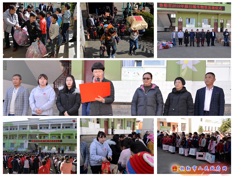 1月4日下午,由团市委、市总工会、市妇联共同组织的2019年“腊月暖冬行动”活动捐赠仪式在弥勒市东山镇新寨小学举行。市人大常委会副主任伏燕出席活动,并代表市委、市人大、市政府、市政协向山区师生、受助群众致以新年的问候,团市委、市总工会、市妇联及东山镇党委政府相关领导出席活动。
