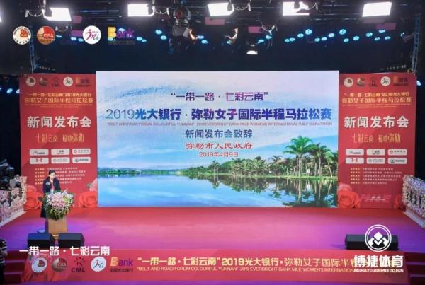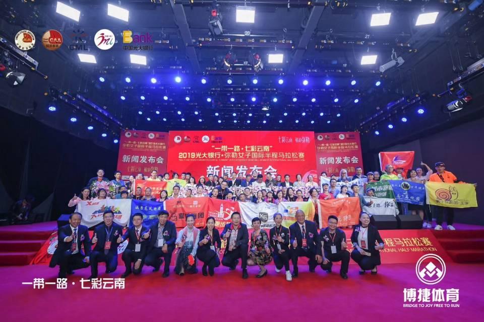 2019年4月9日下午,“一带一路·七彩云南”2019光大银行·弥勒女子国际半程马拉松赛新闻发布会在云南广播电视台4K高清演播厅成功举行。云南省体育局竞赛管理和青少年体育处副处长雷波、红河州教育体育局副局长黄春、弥勒市人民政府副市长田红梅、中国光大银行昆明分行党委委员副行长王迅等领导,与云南新闻联播、云视网、云南手机台、云南网、云南日报、云南广播电视报、昆明日报、春城晚报、云南信息报、云南交通之声FM91.8、云南新闻广播FM105.4、红河电视台、红河日报、红河新媒体中心、弥勒市融媒体中心等媒体记者和弥勒协跑、弥勒乐跑协会、成都女子跑团、眉山全民酷跑、昆明跑吧、安宁跑团、海鸥跑团、大理跑团、特高压跑团、云南乐跑团、海埂跑团、玉溪跑吧、罗平跑团、红河州路跑协会、云南悦跑团蒙自分队等跑团代表应邀参加新闻发布会。