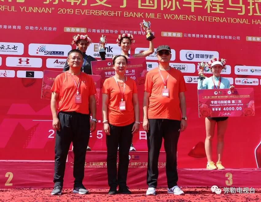 【云南省体育局副局长吴亚敏(前排中),中共弥勒市委书记包旭(前排左),光大银行昆明分行行长张屹(前排右),为半程马拉松个人赛前三名颁奖并合影】