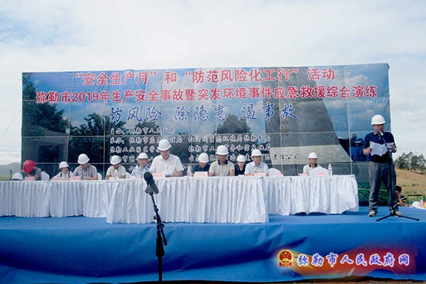 6月20日,弥勒市举行生产安全事故突发环境事件演练活动。市委常委、常务副市长、市安委会副主任马金荣,市政协副主席赵学磊参加演练活动。