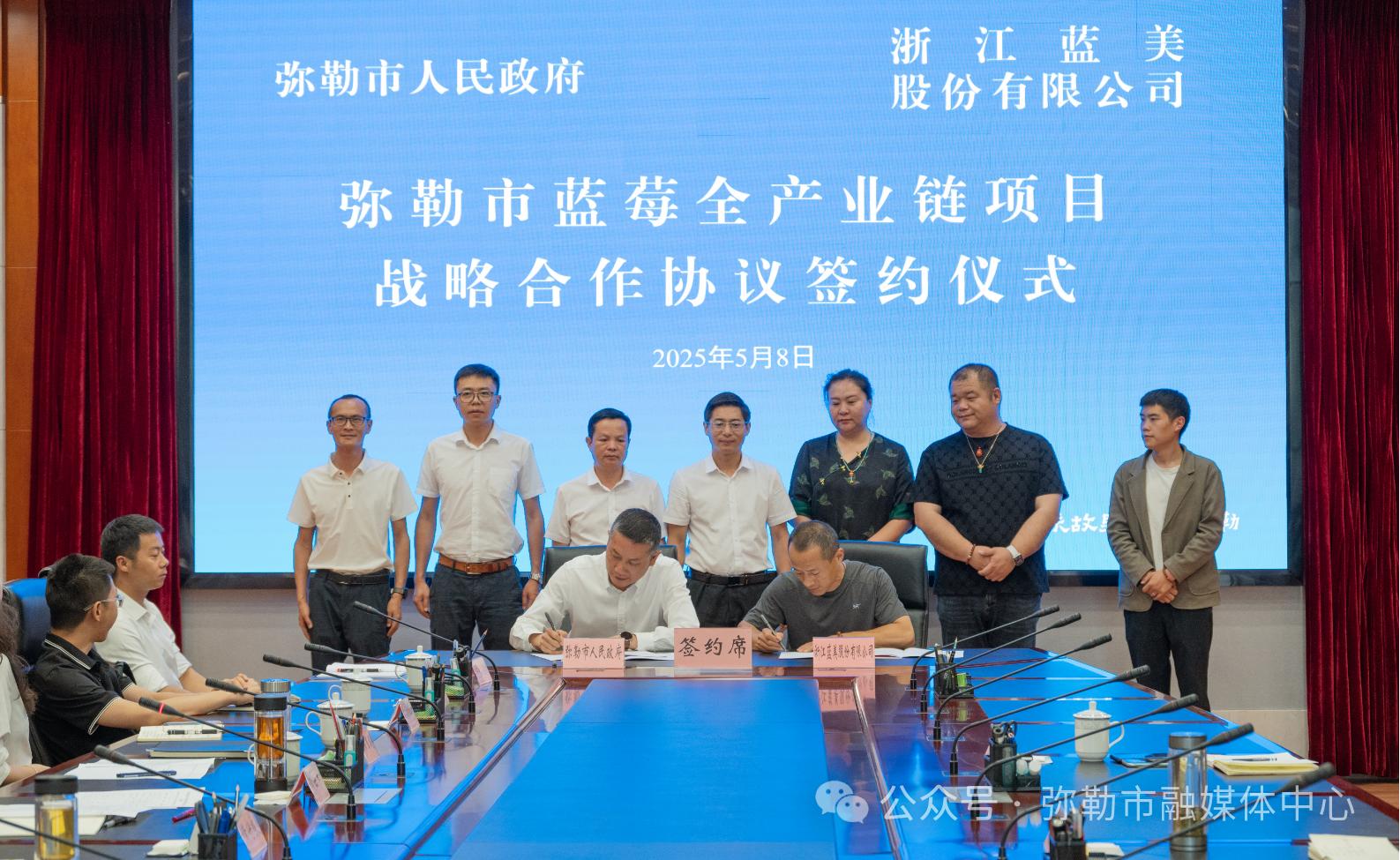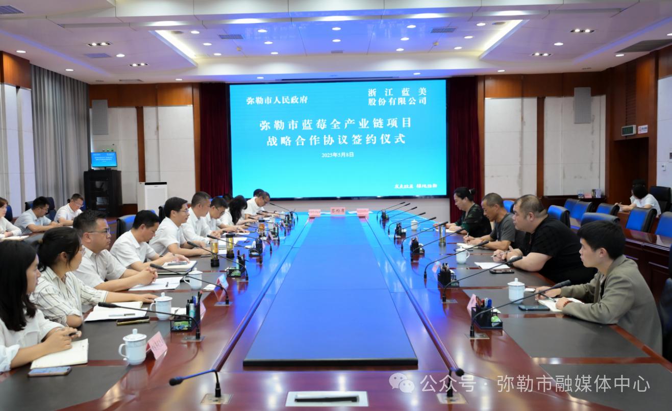5月8日,市人民政府与浙江蓝美股份有限公司签订弥勒市蓝莓全产业链项目战略合作协议,市委副书记黄守良出席并致辞,市政府副市长袁云杰主持签约仪式,蓝美股份有限公司副总裁许钢梁出席。