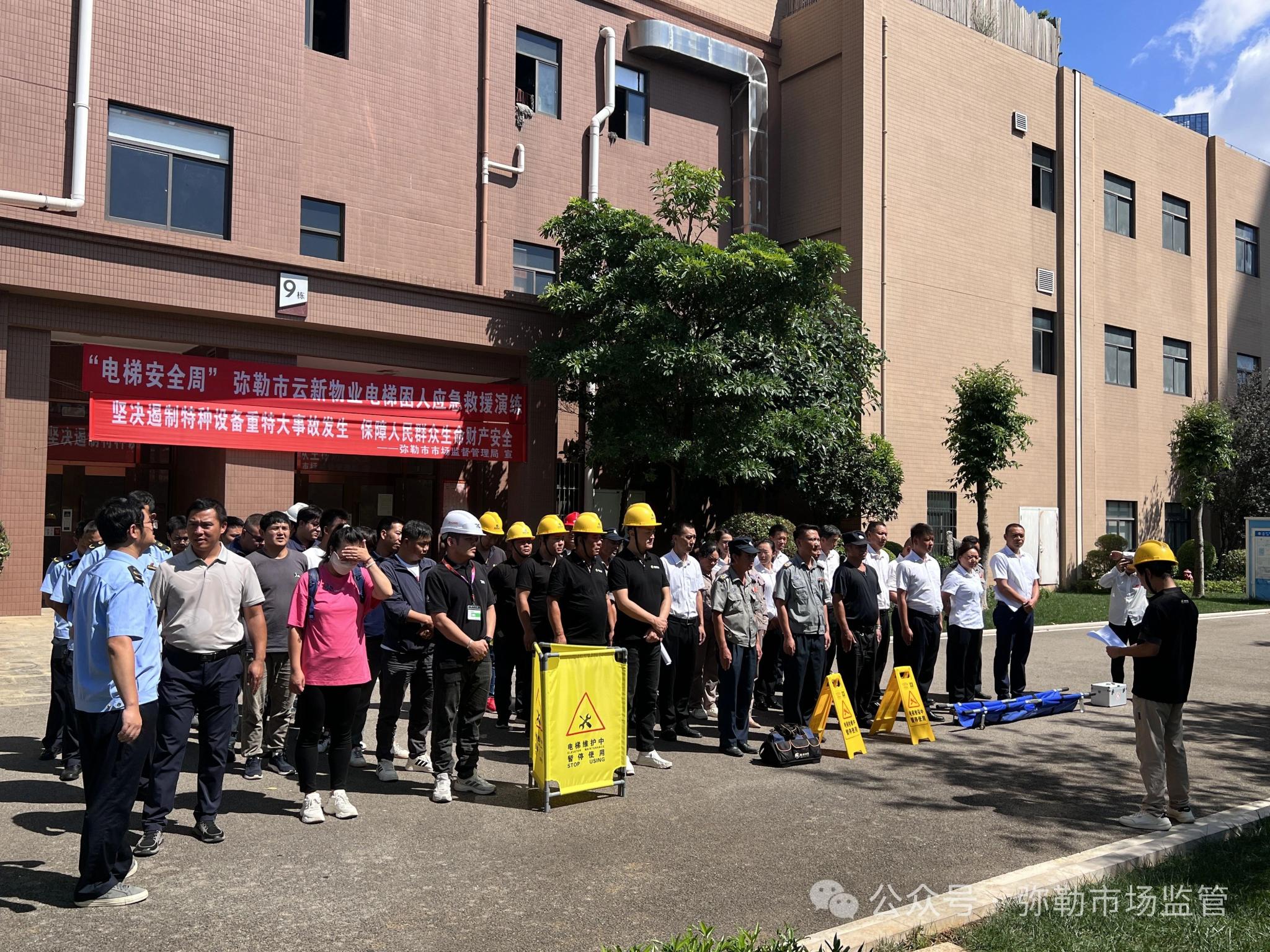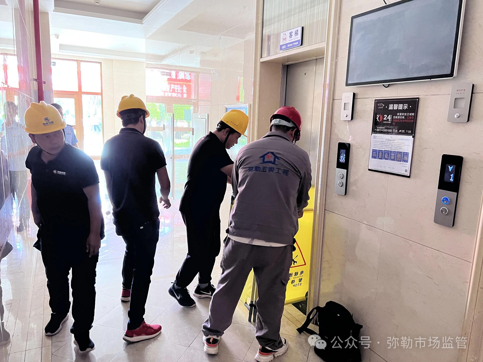 为预防和减少电梯困人事故的发生,提升电梯运维人员和相关人员的应急能力,强化协同救援能力,近日,由红河州市场监督管理局特种设备监察科牵头,弥勒市市场监督管理局组织邀请全市十余家电梯维保单位、使用单位到北辰明珠A区,现场观摩学习2024年“电梯安全周”活动——弥勒市云新物业电梯困人应急救援演练。
