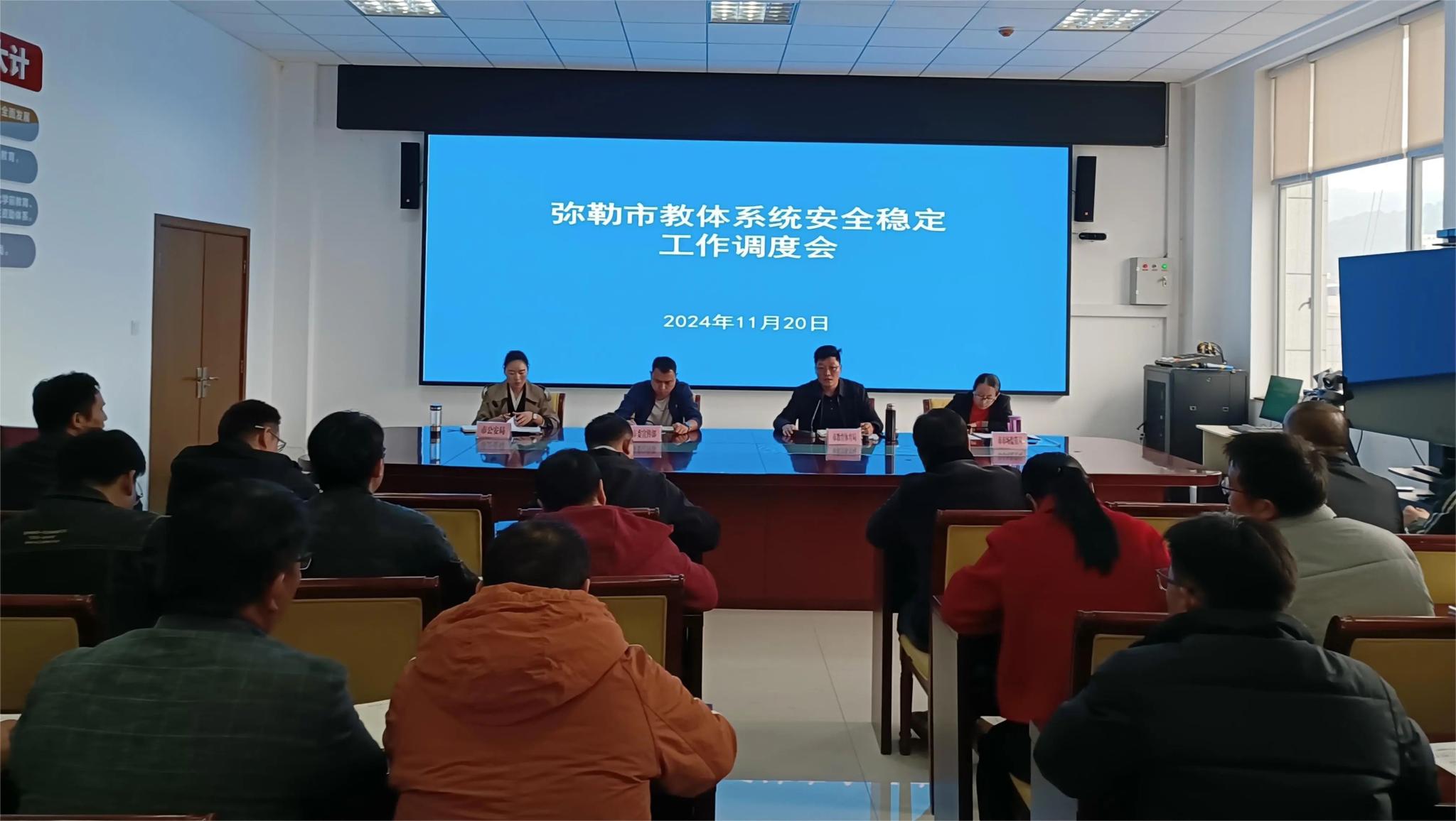 2024年11月20日,在参加完全省教育系统校园安全稳定工作调度会后,弥勒市接着组织召开了全市教体系统安全稳定工作调度会,市委网信办、市教育体育局、市公安局、市市场监管局相关负责同志参加会议并作相关工作安排。