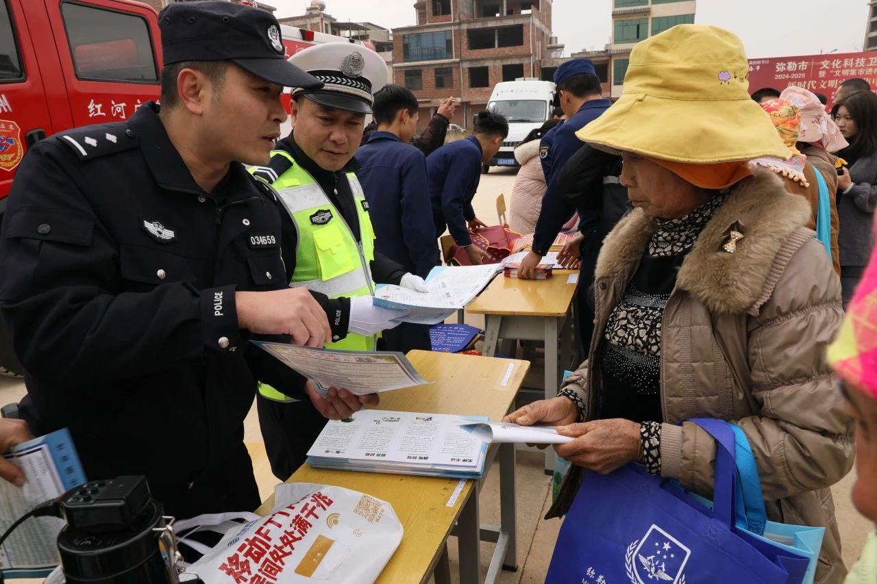 1月16日,弥勒市2024—2025年文化科技卫生“三下乡”、 “法律进万家”、“文明集市进村镇 移风易俗倡新风”新时代文明实践集中示范活动在弥勒市五山乡彝山小镇举行。弥勒市公安局以“三下乡”活动为契机,多警种联动、多形式开展普法宣传活动。