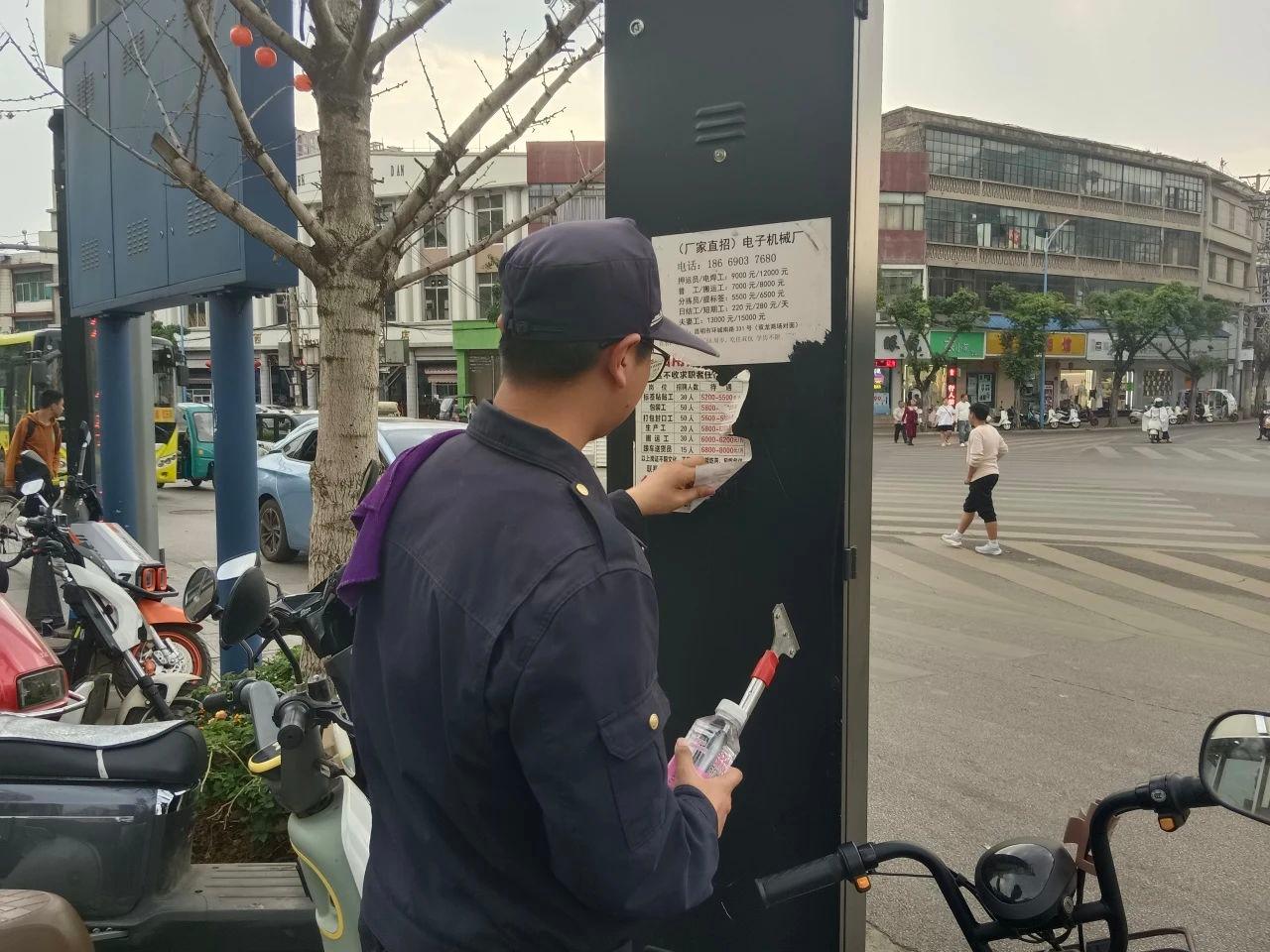 针对排查出的非法小广告,执法人员立即采取 “撕、铲、擦” 等方式进行清理,累计清除小广告 97处,有效恢复了立面整洁。同时,严格落实 “一案双查”,对为违法小广告提供场所的 16 家物业及商户进行约谈教育,引导树立环保意识。