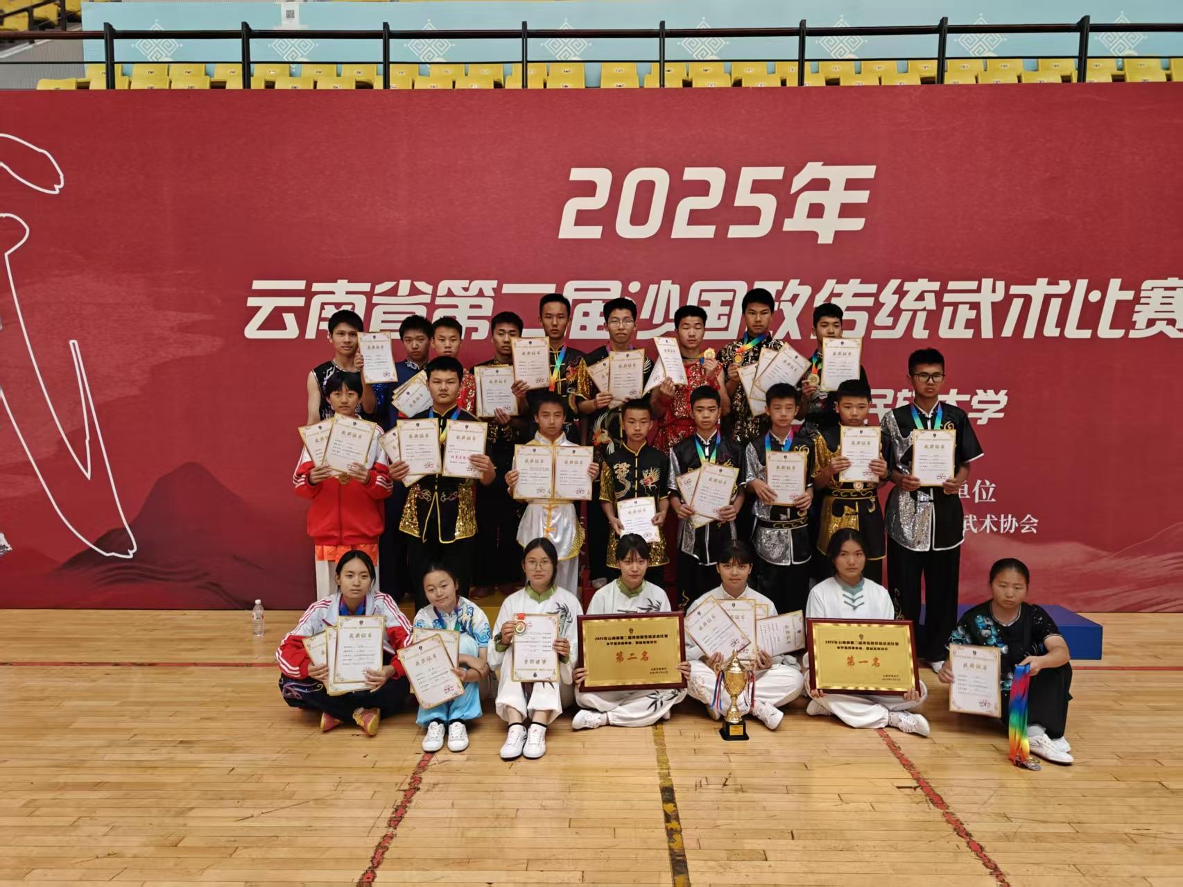 滇南武校武术队24名学生分别参加了小学男子、女子甲组、中学男子甲组、中学男子乙组、中学女子甲组、中学女子乙组等多个单项、集体和对练比赛,经过三天紧张激烈的角逐,滇南武校运动员付娆、刀杨燕、刘语珊、陈欣、马志娟、王家欣、邵有强在比赛中勇夺金牌,滇南武校武术队共取得8金7银4铜的好成绩。另外,滇南武校武术队还荣获“体育道德风尚队”荣誉称号。