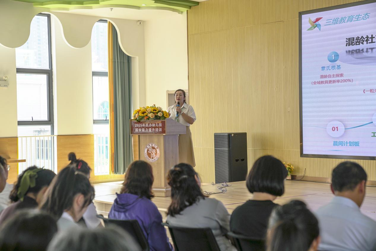 活动安排了三所民办幼儿园进行经验交流。俊峰幼儿园园长葛巧艳以“尊重童心,让教育在多元体验中绽放光芒”为题,分享了该园在自主游戏探索与实践方面的成功经验。