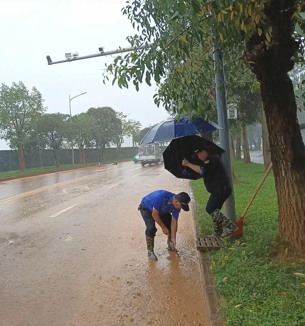 面对暴雨带来的突发考验,执法队员迅速转换角色,化身“安全哨兵”,通过“人巡+车巡”的方式加强对户外广告牌、施工围挡等设施的排查,织牢“隐患巡查网”。同时加强对城区内低洼路段的巡查,通过清理堵塞管道、引导积水排放等措施织好“积水处置网”,有效缓解路面积水问题,全力保障道路畅通。