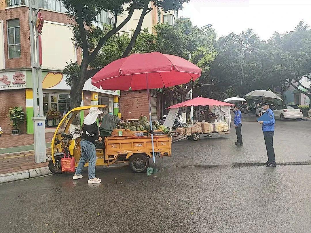 执法队员冒雨坚守岗位,始终秉持“管理标准不降、执法力度不减”的工作原则,持续夯实城市管理基础工作。针对临街商铺店外经营、流动摊贩占道经营、非机动车乱停乱放等市容乱象进行整治,坚持劝导和疏导同步、规范与整治并行,积极引导商户入店经营,并帮助清理乱摆乱放,做到发现一处、整改一处、清理一处,确保暴雨期间人行道畅通无阻,为市民营造安全有序的出行环境。