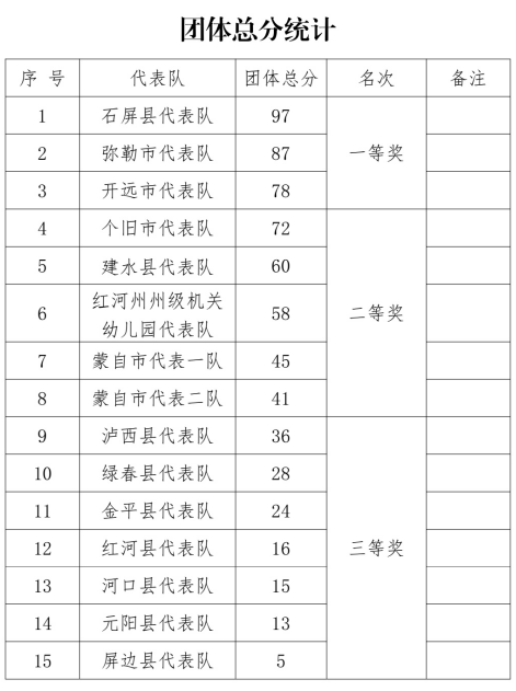 弥勒市第一幼儿园、弥阳佰花幼儿园、弥阳和境幼儿园、弥阳欧莱特幼儿园、弥阳北辰明珠幼儿园、弥阳艾乐幼儿园、弥阳如家幼儿园、弥阳博苑幼儿园获得优秀组织奖。