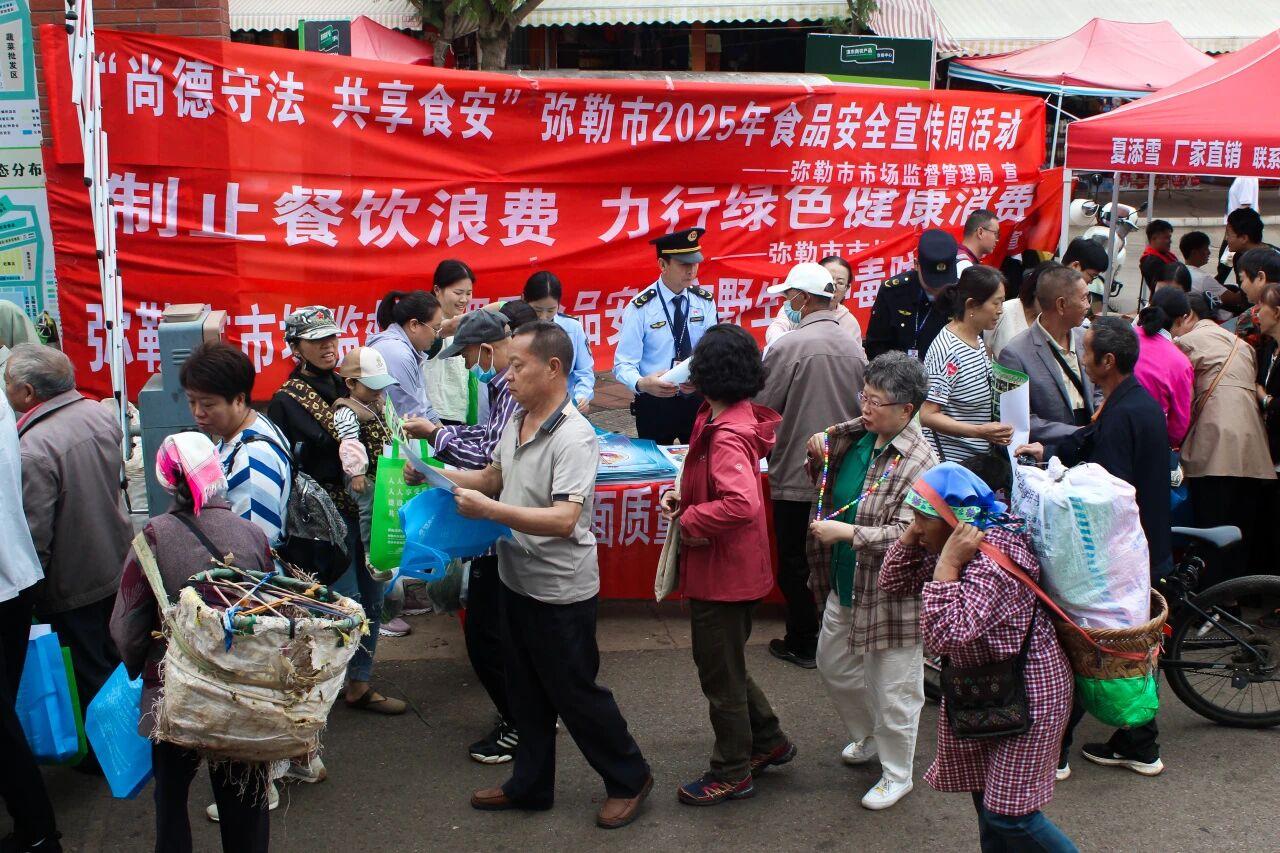 为普及食品安全知识、提升公众安全意识、筑牢社会共治防线。9月24日,弥勒市食安办牵头开展以“尚德守法,共享食安”为主题的食品安全宣传周活动,市公安局、市农业农村局、市教育体育局、市卫生健康局等成员单位参加活动。近日,各市场监管所联合乡食安办组织开展2025 年食品安全宣传周系列宣传活动,形成市、乡两级联动普及食品安全知识,营造社会共治共享氛围的良好局面。