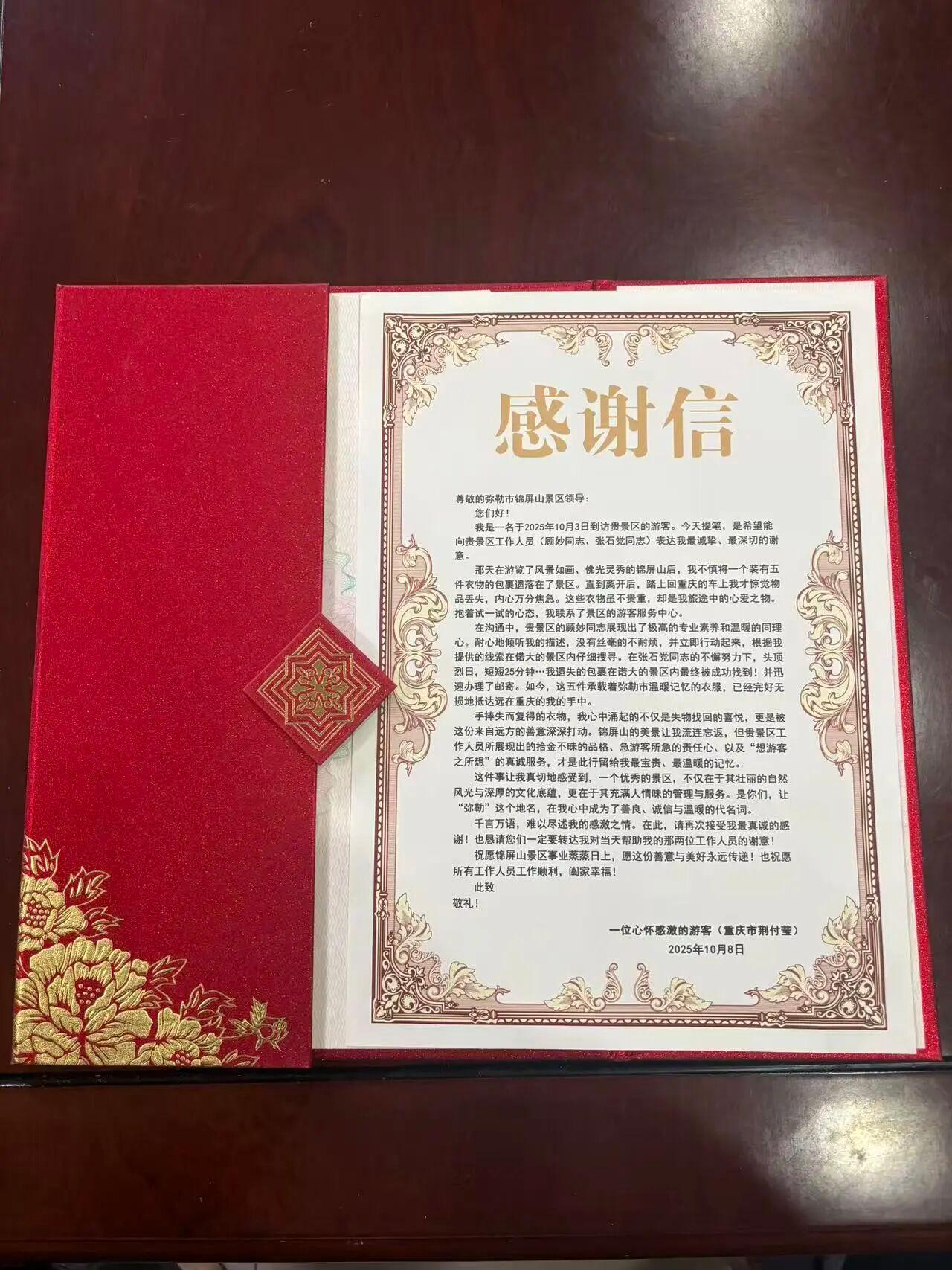 2025年10月3日,重庆游客荆女士到锦屏山风景区游玩时,不慎将装有衣物的包裹遗落在了景区,直至返程途中才发现,内心万分焦虑。她立即联系景区游客中心,景区工作人员顾妙、张石党立即根据荆女士提供的线索,成功找到了荆女士丢失的包裹。荆女士收到失物后寄来感谢信,表达由衷感激。