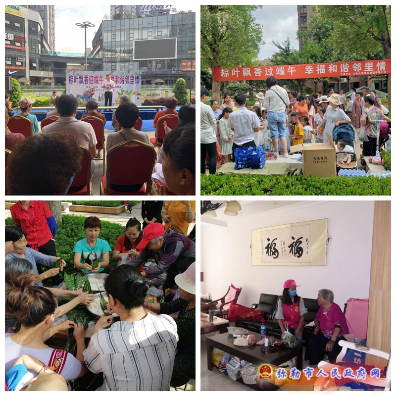 端午节来临之际,为丰富居民精神文化生活,弘扬民族精神,传承中国传统文化, 促进邻里和谐相处,弥阳镇城西、古城、福地等社区先后和云新物业公司携手在佛城广场、湖泉尚景、北辰明珠等小区开展以”粽叶飘香过端午,幸福和谐邻里情”为主题的迎端午活动。