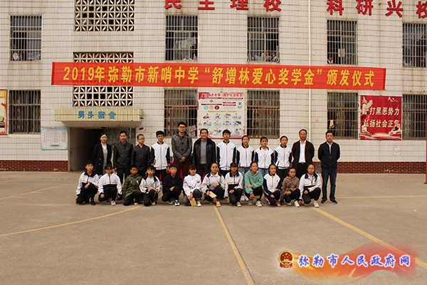 92岁的舒增林先生,原是弥勒市新哨镇郎才社区郎才村人,现定居曲靖,是一名中共党员。2019年3月,因病卧床不起的舒增林先生还牵挂着家乡的教育事业, 希望在有生之年能为家乡的教育事业贡献一份力量。随后,他与新哨中学、弥勒市教育体育局联系,在新哨中学设立了以其名字命名的“舒增林爱心奖学金”,旨在帮助该校品学兼优的学生顺利完成学业。该爱心奖学金资助年限暂定为5年(2019年9月- -2023年9月),每年奖励品学兼优的学生18人,奖励金额为18000元,5年合计金额9万元。以后视情况再调整增加年限。