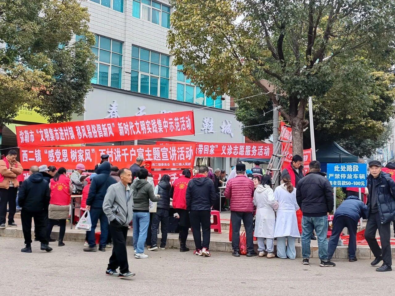 12月26日,弥勒市“文明集市进村镇 移风易俗倡新风”新时代文明实践集中示范活动在西二镇举办,市委文明办、市卫生健康局、市委社工部、市科协、市老年诗书画协会,以及西二镇新时代文明实践所、镇社会事务办、镇党群服务中心、西二中心卫生院等单位,利用周四赶集日,结合部门职责集中开展移风易俗、卫生健康、科普知识等宣传。