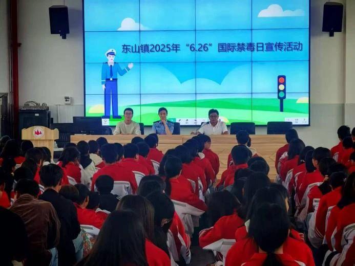 警示教育进学校,筑牢校园防护网。东山镇结合“6.26”国际禁毒日,联合镇平安法治办、派出所,到东山中学开展禁毒宣传活动,以“防范青少年药物滥用”为主题,开展知识讲座,向师生普及传统毒品与新型伪装毒品(如“奶茶”“跳跳糖”等)的危害,同时结合真实案例,警示学生“不因好奇尝试、不轻信陌生人馈赠”,并传授防毒技巧,强化学生拒毒意识。此次活动覆盖500余名师生,发放宣传资料400余份,有效筑牢校园防毒墙。