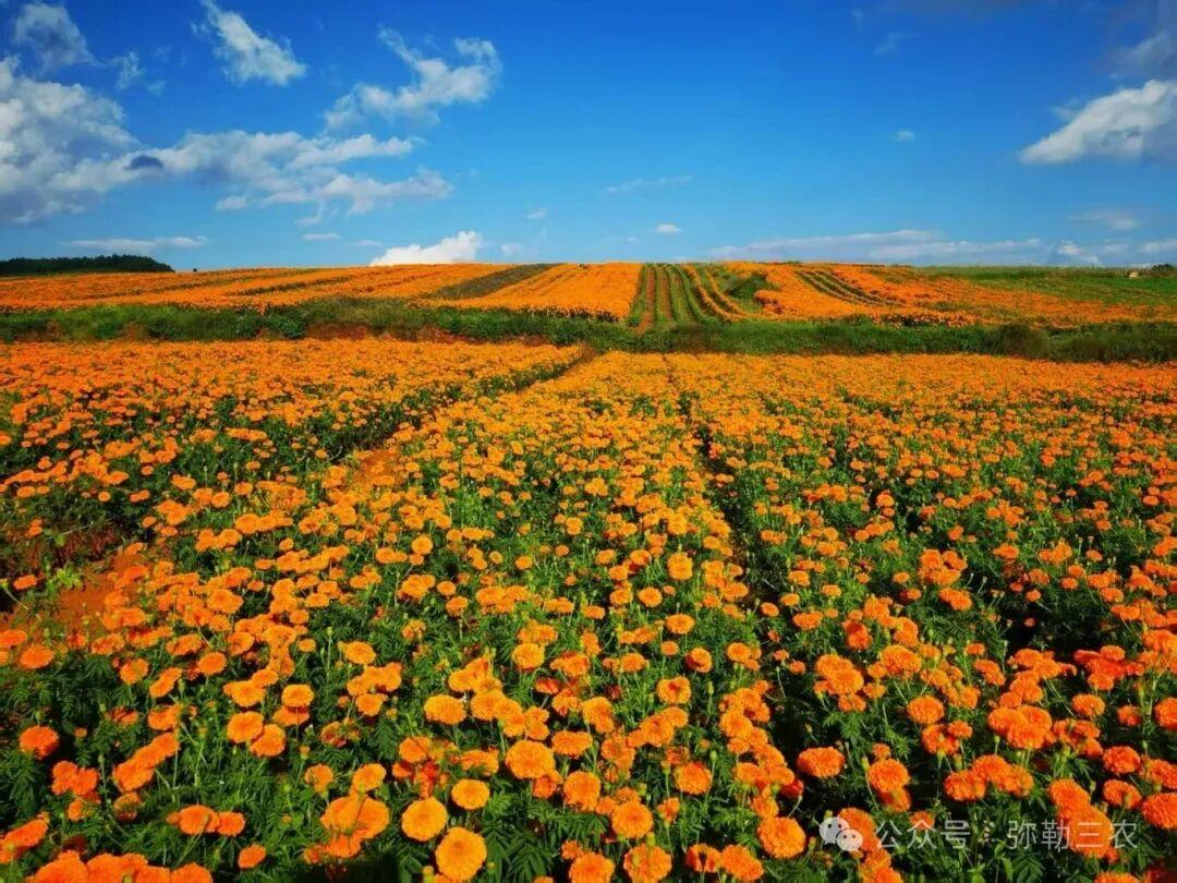 在矣维村委会2023年示范种植“烟+花”成功实现“双增收”后,近年来其他村党组织纷纷组织党员干部到矣维村学经验、取真经,守正创新,带动农户打出“烟+瓜”“烟+豆”等多元组合牌,融入推广“烟+花”发展模式,让党建引领的“红利”实实在在惠及给村集体与每一个农户。2025年,引导756户农户在烟田里种植万寿菊6100亩,群众每亩仅需投入130元,亩均收入便可达3000余元,群众烟田增收达2000余万元左右。种植期间,每年12月底育烟苗,次年4月栽种,6月开始培育万寿菊苗,7至9月可采摘烟叶,8月底种下万寿菊,半个月便能开花,一期可采6至7次,一直持续到11月中旬。为进一步提高农户收益,在轮作中鼓励群众栽种豌豆、西葫芦等应季高产和高收益的蔬菜,除“烟+花”外,今年发展“烟+瓜”约2000亩、“烟+豆”360余亩,预计总收入1100余万元。持续坚持“10月花+11月瓜+12月豆”这种土地轮作方式,真是季季有产出、月月有收入,有力促进农业增效、农民增收。