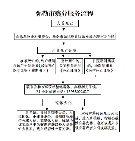 人员死亡后,家属向村组或原单位报告,到医疗机构或公安机关办理死亡证明,联系殡仪馆专车接运,其他任何单位和个人不得接运和冷藏遗体;凡属弥勒市行政区域外异地死亡者,其遗体原则上就近、就地火化;如有特殊情况确需运回当地,家属需持当地民政部门开具的接收证明到运出地民政局办理转运手续,经运出地民政局审核同意后,由殡仪馆专车接运。