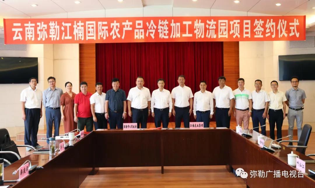 7月25日,弥勒市人民政府与江楠农业集团签订农产品冷链加工物流园项目投资协议。市委书记梁凌云,市委副书记、市长李健,市委常委、常务副市长马金荣,副市长邱云春,弥勒工业园区管委会主任唐举顺,江楠农业集团董事长、广州江南果菜批发市场经营管理有限公司董事长叶灿江,江楠农业集团副总经理、广州市骏塱市场开发经营管理有限公司总经理杨宇明等出席签约仪式。