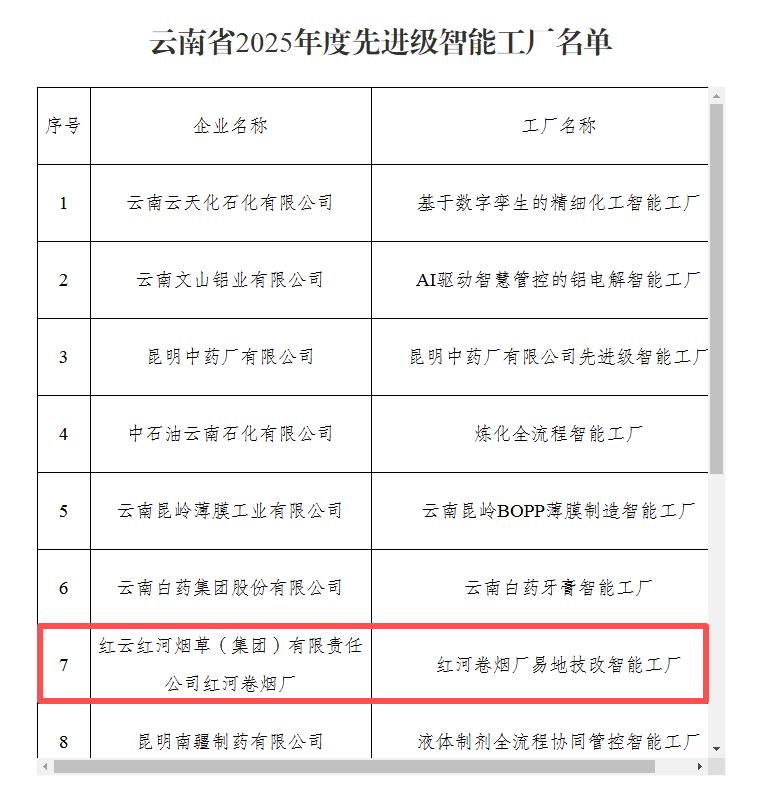 近期,省工业和信息化厅印发云南省2025年度先进级智能工厂名单,红云红河烟草(集团)有限责任公司红河卷烟厂易地技改智能工厂成功入选。红河卷烟厂以易地技改为契机,实现从传统制造到智慧生产的跨越式转变。项目参考智能工厂国家标准,结合烟草加工行业特性,大力引入数字化工艺装备和先进控制系统,采用数字化、智能化技术开展集成实施。在生产执行方面,构建自动化控制系统,并在关键工序或生产单元设备实现了在线数字化检测、异常预警、在线分析、智能优化控制;在生产管理方面,实现高效、精准、敏捷、协同、闭环的生产运行及管理。在原辅料、成品供应方面,打通与供应商的数据链,全面提升协同性与精准交付能力。工厂投产后生产效率、质量、物耗控制及绿色生产指标得到较大提升。红河卷烟厂易地技改智能工厂的建设不仅是企业自身发展的新引擎,也是推动云南省制造业高质量发展、提升区域经济竞争力的重要力量。既解决了传统生产的效率痛点,也为区域产业升级注入动力,更成为烟草行业高端化、智能化、绿色化转型的标杆,实现了“企业效益、区域价值、行业示范”的三重价值统一。