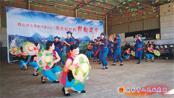 这次联欢是中和铺村小组老年人协会成立30周年的一次大型庆典活动,京剧戏曲艺术团则是应邀参演的27支文艺队中唯一一支汉族队,他们表演的歌舞《十送红军》、抗战剧《地道战》,赞扬了老区人民与人民子弟兵的深情厚谊,歌颂了他们的英勇抗战精神,赢得了数千观众的阵阵掌声。艺术团的同志们也为阿细同胞们表演的《歌唱十九大》《革命老区新面貌》等节目热烈鼓掌。