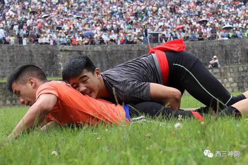 十里八乡的摔跤是弥勒各民族,特别是阿细人最热闹的节庆活动之一,只要哪天见到集市上有人戴着草帽、 肩拖长布沿街叫喊“来看摔跤了,来看摔跤了,哪年哪月哪日在某某村子要摔跤了”,平时忙于农活而显得沉静的西山,整个儿一时便炸了锅似的沸腾了。 阿细人个个喜形于色,奔走相告。阿细人男女老少无一不爱摔跤。为什么都爱摔跤?一是阿细人天性快乐,喜欢聚在一起开心,摔跤场上游人如织,热闹自不必说。二是阿细人好客,平常各忙各的,没时间亲朋相聚,摔跤活动是最好的相聚理由和机会。一听说摔跤, 便立马想方设法联系自己的新朋老友、亲戚弟兄。作为摔跤主办村的阿细人家家户户便开始买酒备菜了,到时绝对摆出他家最好的好酒好肉好菜,绝不保留。其余村寨的阿细人也开始农事安排调整,以便到时快活一天。三是阿细人是个英雄崇拜的民族,这是最主要的因素,场上的英雄可是阿细姑娘择偶的首要标准。