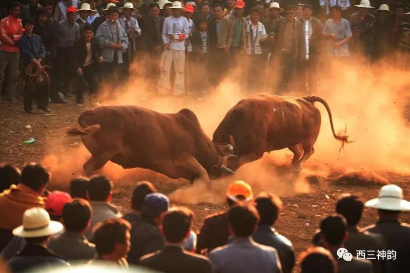 阿细斗牛已有1000多年历史。每逢火把节、春节或遇重要喜庆活动,人们便以村或乡、镇为单位举行斗牛比赛。比赛时参赛的牛被牵到一起进行顶力和耐力较量,以淘汰的方式决出“冠军”。