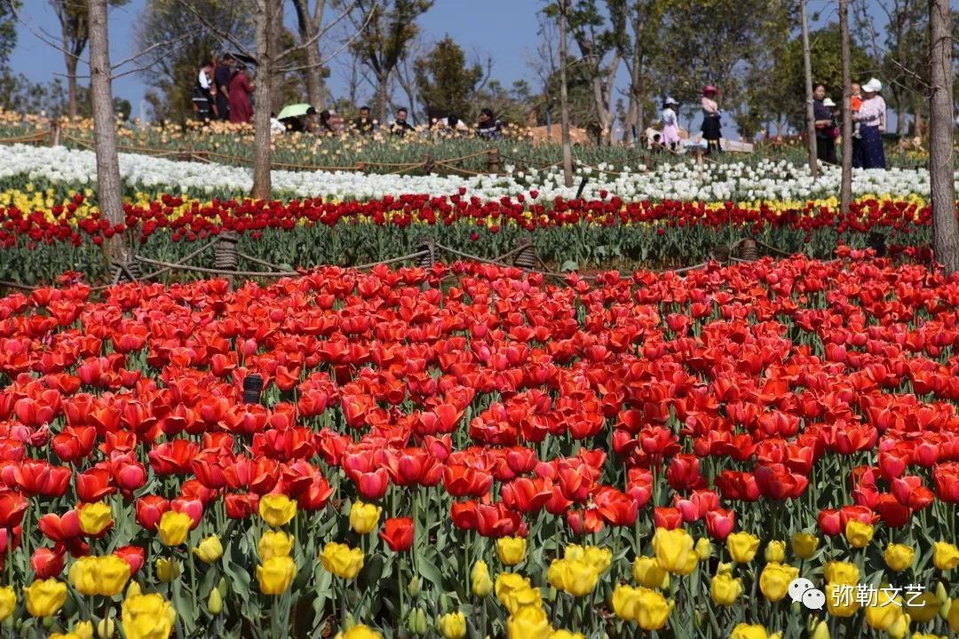高贵的郁金香在太平湖的波光潋滟中高举酒杯,欢迎踏青而来的客人,鲜花美酒敬宾客,一杯美酒一个梦,杯杯美酒幸福颂。颂歌新时代、颂歌美好生活。这外国泊来的名品在异国的土壤越发生长得娇艳动人,沉醉于这方水土,粉的娇、红的艳、紫色的高贵、黄色的灿烂,招来蜂飞蝶舞。