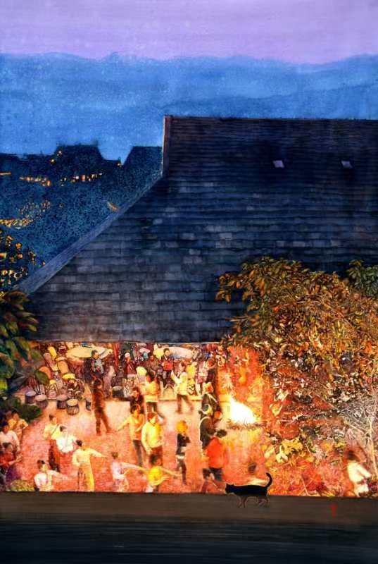 《快乐拉祜》创作背景:2023年12月份,作者到普洱市澜沧县景迈山游玩时拍照获得一手素材。作品借助了拉祜山寨的特色建筑及篝火晚会中游客与村民其乐融融、光影交融的独特审美视角,刻画了边疆少数民族村寨践行“乡村振兴战略”大力发展旅游经济的美好情景。