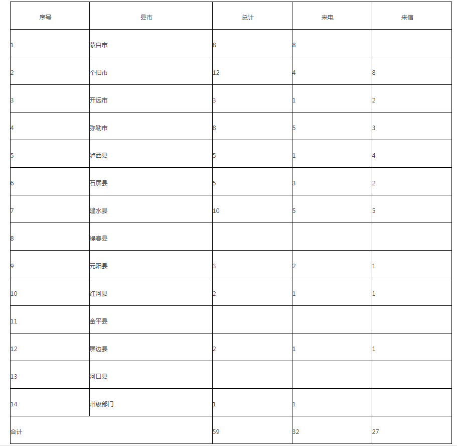截至4月23日,省边督边改组转办群众举报投诉生态环境问题共十六批59件,涉及县(市)10个;州级有关部门1件,个旧市12件,建水县10件,蒙自市、弥勒市各8件,石屏县、泸西县各5件,开远市、元阳县各3件,红河县、屏边县各2件;其他县(市)尚未收到举报件。