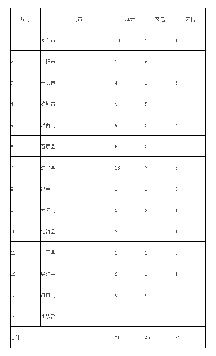 截至4月25日,省边督边改组转办群众举报投诉生态环境问题共十八批71件,涉及县(市)12个;州级有关部门1件,个旧市14件,建水县13件,蒙自市10件,弥勒市9件,泸西县6件,石屏县5件,开远市4件,元阳县3件,红河县、屏边县各2件,金平县、绿春县各1件;其他县(市)尚未收到举报件。