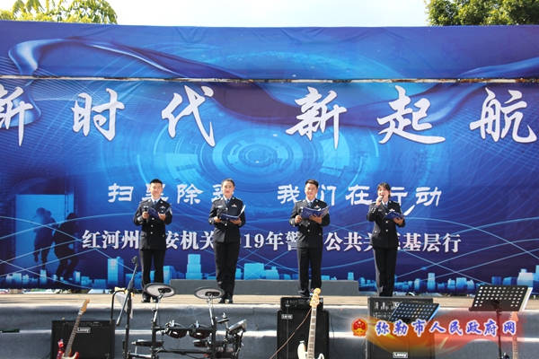 1月18日下午,“新时代 新起航——扫黑除恶 我们在行动”红河州公安机关2019年警察公共关系基层行活动在弥勒市乡村大舞台隆重举行。州公安局政治部副主任宋丽娜,市公安局党委副书记、政委赵银光出席活动并致辞,市公安局、团市委、市人社局、市妇联、市防艾办、市消防大队、中国移动弥勒分公司等相关部门领导及市公安局民警参与活动宣传,近400名市民参加了活动。