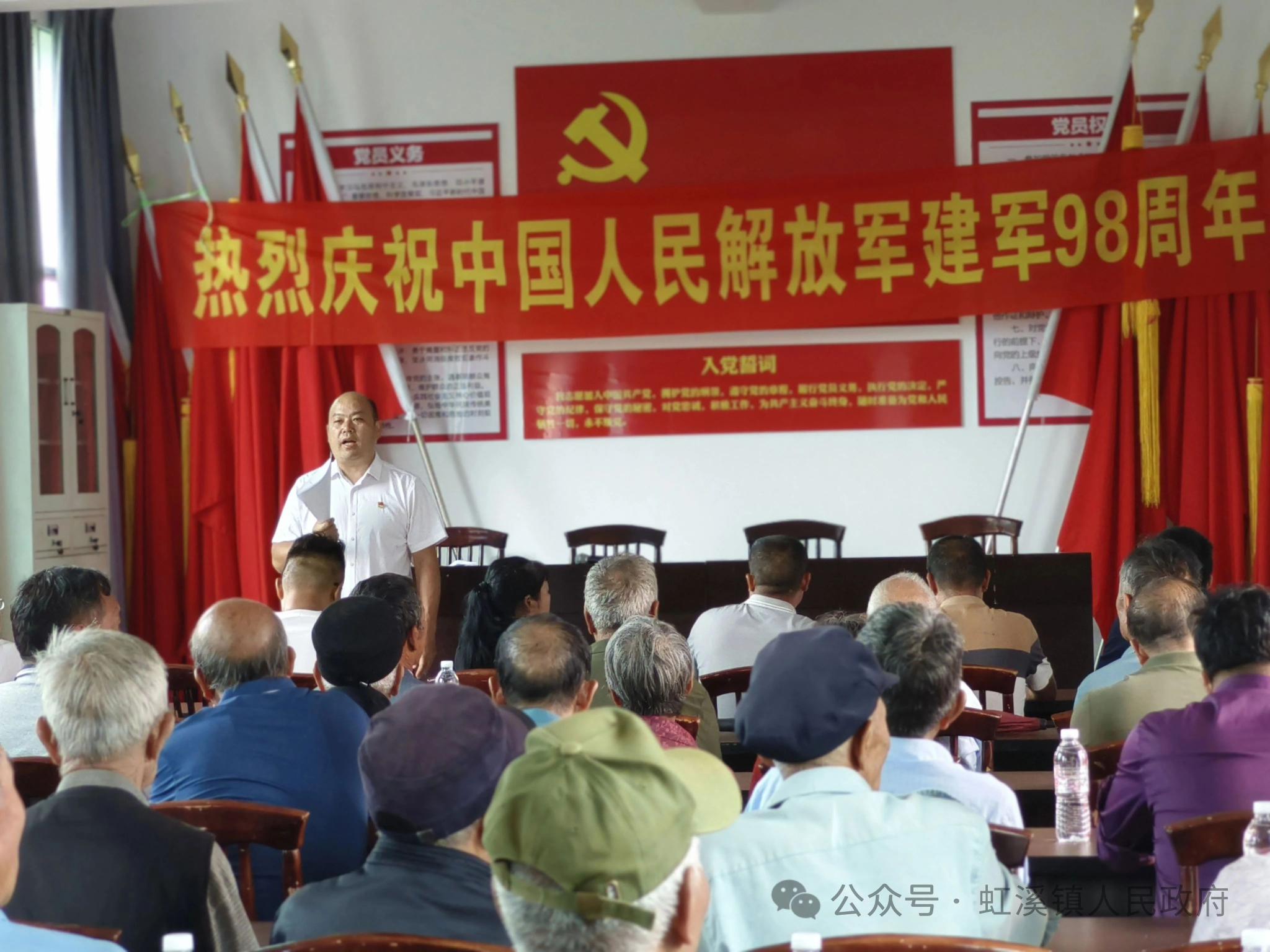 为热烈庆祝中国人民解放军建军98周年,贯彻落实习近平总书记对双拥工作的重要指示精神,传承红色基因,弘扬建军精神,近期,虹溪镇开展“赓续强军魂·共绘新未来”八一建军节系列活动,向为国家和人民作出贡献的退役军人送上节日的祝福与诚挚的敬意。