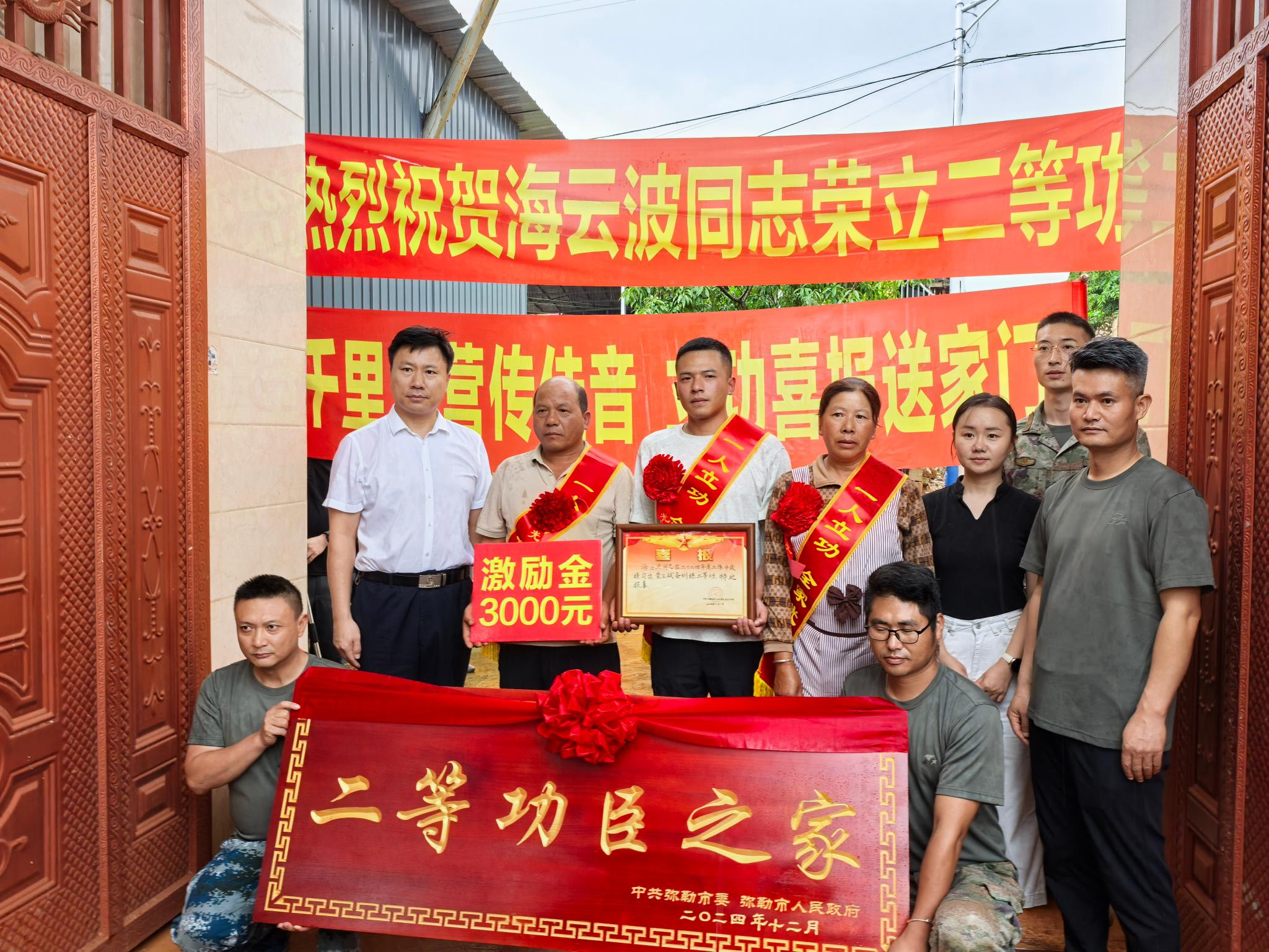 7月25日,弥勒市人民政府、市人武部、市退役军人事务局等军地领导,为荣立二等功的现役军人海云波家庭送去立功喜报、“二等功臣之家”牌匾及激励金。
