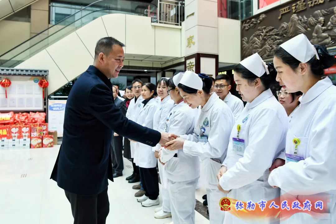 在弥勒市中医医院,李健与医护人员亲切握手,对他们坚守一线,用精湛的医术守护人民健康,用敬业奉献诠释医者仁心给予充分肯定,希望大家在节日期间恪尽职守、尽职尽责,加强应急值守,确保患者及时就医。同时,勉励大家要在新的一年里,务实苦干,开拓进取,推动全市医疗卫生事业再上新台阶,为全市人民群众的身体健康保驾护航。