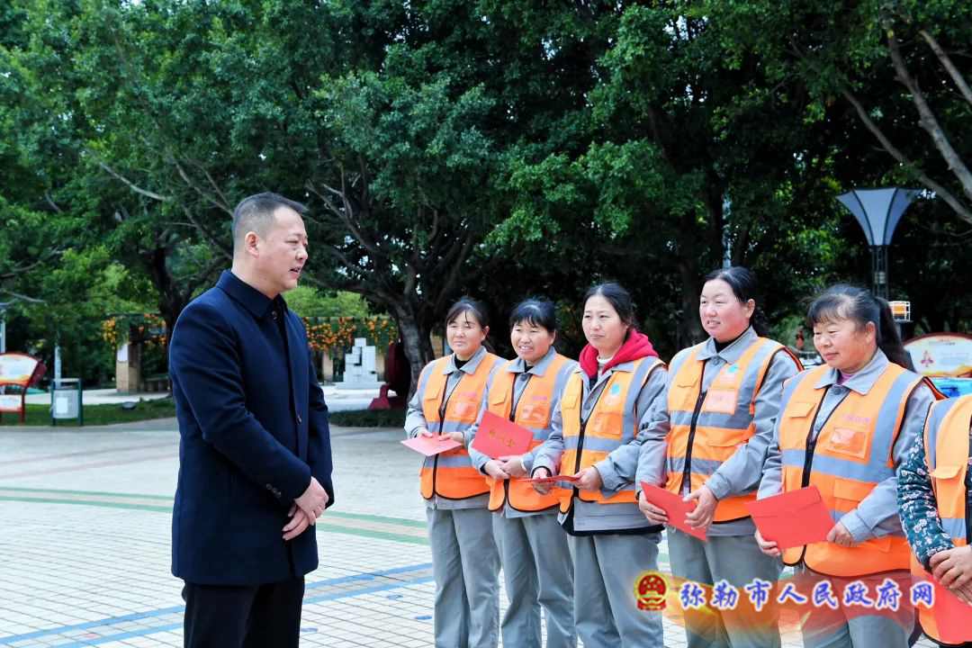 在看望慰问环卫工人时,李健说,环卫工人用勤劳的双手扮靓城市,为保障城市的干净整洁默默奉献,是最美的劳动者。李健代表市委、市政府,向广大环卫工人过去一年为全市创造优美、舒适、洁净的市容环境所付出的辛勤劳动表示衷心感谢。李健叮嘱大家要注意防寒保暖和作业安全,继续发扬无私奉献精神,认真做好春节期间保洁工作,共建和谐美丽的幸福家园。