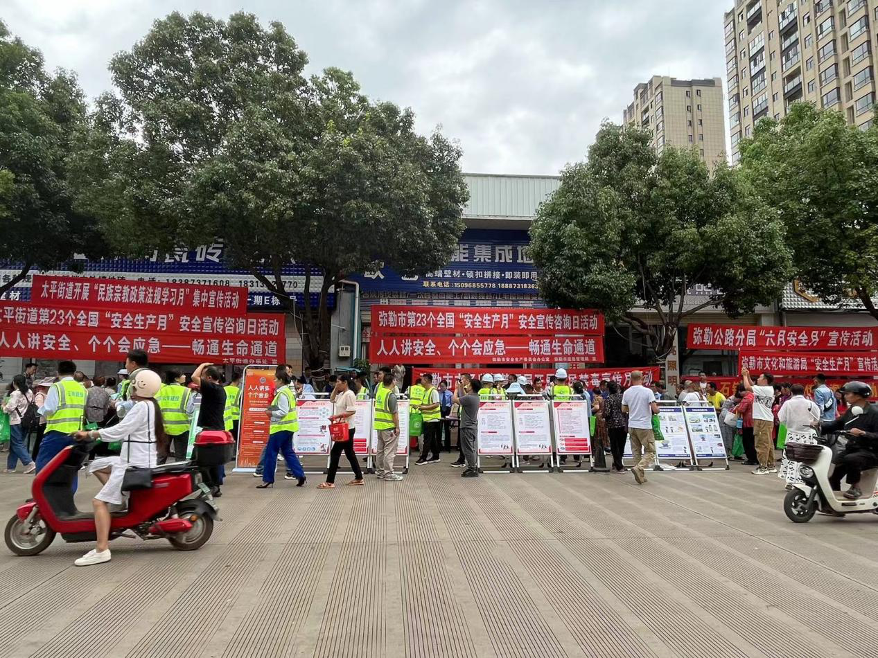 6月12日,弥勒市安委办组织太平街道办事处、市应急局、市市场监管局、市公安局、市交通运输局、市消防救援大队等20家单位在滇东南农贸市场开展第23个全国“安全生产月”安全宣传咨询日活动。此次活动以“人人讲安全、个个会应急——畅通生命通道”为主题,面向社会公众和从业人员集中宣传安全生产方针政策、法律法规、安全生产治本攻坚三年行动、重大事故隐患判定标准,以及安全生产岗位责任、安全知识和避险逃生技能等科普知识,通过发放宣传材料、开展现场咨询服务等形式,与群众进行面对面交流,解答广大群众关心的安全生产问题。目的是通过形式多样的安全宣传教育活动,持续提升公众风险防范、安全应急意识和自救互救能力,努力做到“人人讲安全,个个会应急”。此次活动各单位共出动人员114人、车辆30辆,发放各类安全知识宣传资料20388份,发放环保袋、围腰、海报等宣传物品5900份,悬挂宣传布标17条,设置展板14块,播放宣传影片1部,群众参与活动人数4892人次。