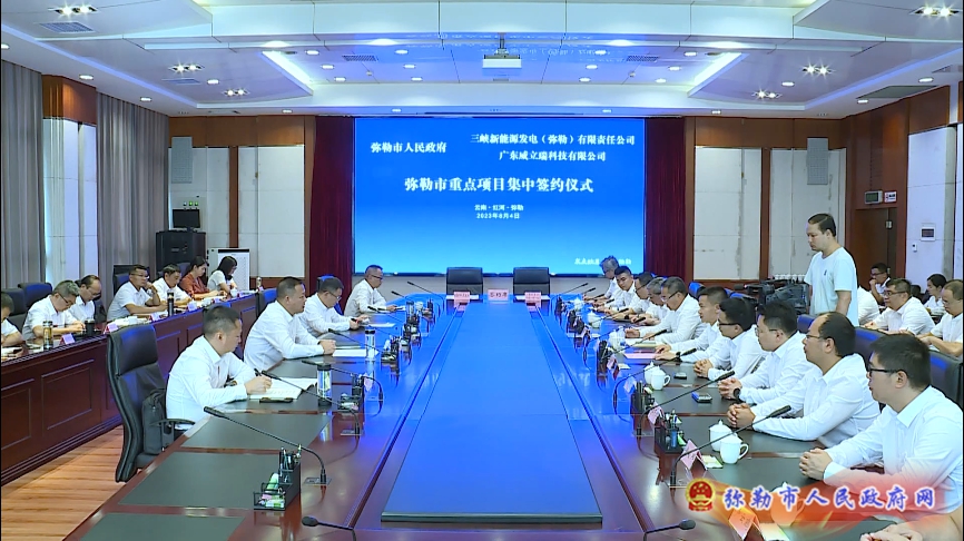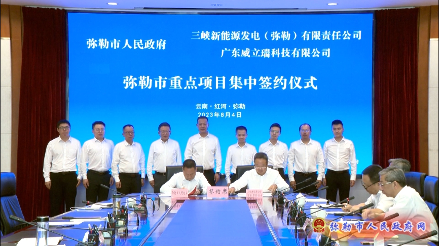 8月4日,弥勒市举行重点项目集中签约仪式,市人民政府与三峡新能源发电(弥勒)有限责任公司、广东威立瑞科技有限公司签署弥勒西风电场二期、弥勒集中共享电化学储能电站、莱乐园康养城项目投资合作协议。市委书记李健出席签约仪式并致辞,市委副书记、市长潘金军主持。副市长孟春明,中国三峡新能源(集团)股份有限公司云南分公司总经理王金仕,广东威立瑞科技有限公司执行董事阮宁出席。