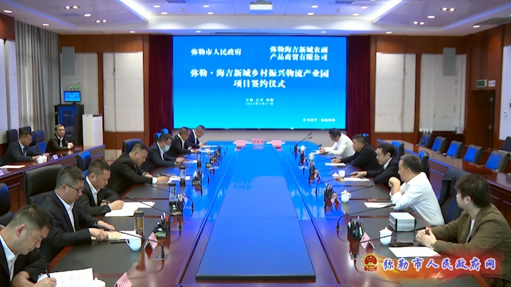 3月21日,弥勒市人民政府与弥勒海吉新城农副产品商贸有限公司签订弥勒·海吉新城乡村振兴物流产业园项目投资合作协议。市委书记李健出席签约仪式并致辞,市委副书记、市长潘金军主持签约仪式。副市长孟春明,弥勒海吉新城农副产品商贸有限公司董事长赵明华代表双方签署投资合作协议。